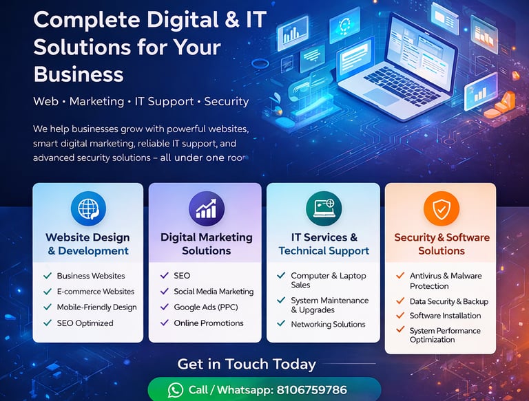 We help businesses grow with powerful websites, smart digital marketing, reliable IT support, and advanced security solutions — all under one roof.